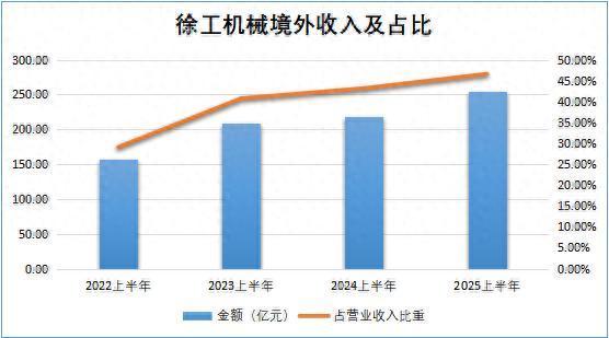今年上半年,在徐工机械548.08亿元收入中,海外收入255.46亿元,同比增长16.64%,海外收入占比自2022年中报的29.07%至上年同期的43.17%,进一步提升至46.61%,3年来稳步提高。